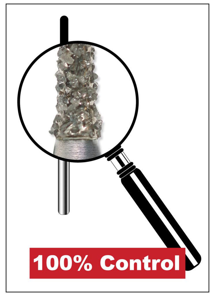 The HBN plating method ensures that there are no “bold” areas and that both the bond matrix and grit are equally distributed on the bur. As a result, minimal pressure is required on the turbine and the prepared tooth surface is left homogenized.