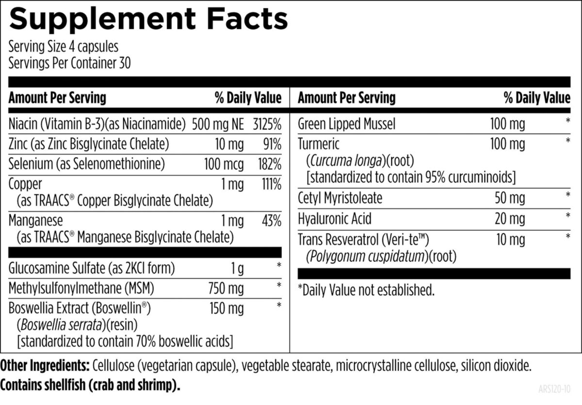 ArthroSoothe™ – Joint Health. Designed to promote optimal joint and cartilage function and healthy inflammatory responses.* May also promote normal collagen status. ArthroSoothe™ provides joints with nutritional support for lubrication, free movement, and healthy function.* Joints, cartilage, ligaments, tendons, and synovial fluid (for joint lubrication) undergo a continuous but slow turnover and remodeling process. This is affected by many physiological factors, such as diet, supplements, activity, stress, gut health, immune status, infections, aging, hormones, toxic load, and/or various medications.*