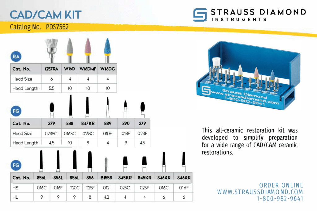 Strauss has developed the PDS7562 All Ceramic Restoration Kit to simplify preparation for a wide range of CAD / CAM ceramic restorations.