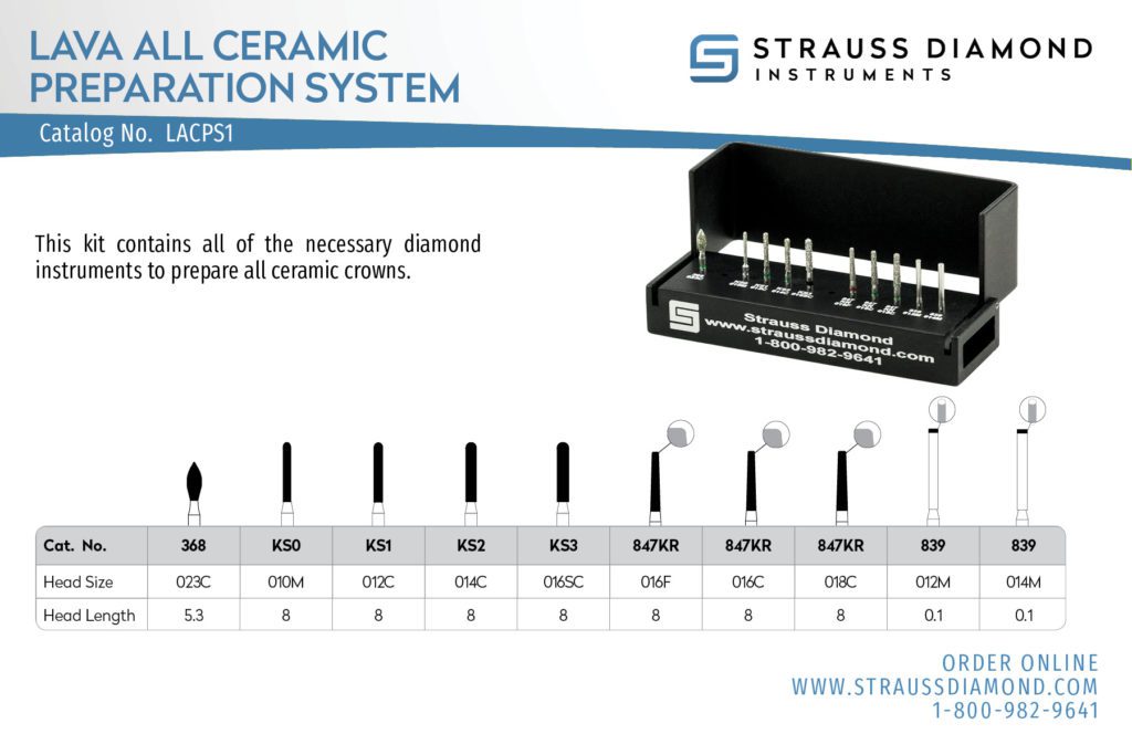 The LACPS1 Lava All Ceram Preparation System contains the necessary diamonds to prepare all ceramic crowns.