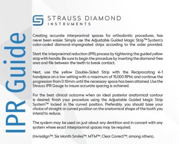 Strauss’ Reciprocating Guided Magic Strip Starter Kit is a breakthrough in Interproximal Reduction. This guided kit includes all of the necessary instruments to achieve a faster and accurate procedure.