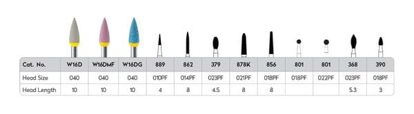 The Magic Touch Kit was designed to include all of the burs necessary to do a Bite Adjustment Procedure. The kit Includes the following burs: an 801/018PF and an 801/022PF for adjusting the marginal ridge, a 390/018PF for adjusting the occlusal surface, a 368/023PF for adjusting the lingual surface, an 862/014PF, an 889/010PF and an 885/012PF for adjusting the margin, and an 878K/021PF for trimming excess material.