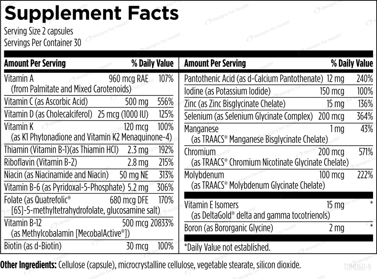 Twice Daily Multi™ contains optimal amounts of many nutrients not easily obtained in most diets. It uses higher quality ingredients than most multivitamins, including vitamin E Isomers as DeltaGold® tocotrienols, a highly bioavailable form of folate, and true amino acid chelate minerals for optimal tolerance and absorption. These exceptional ingredients are combined in an up-to-date, science-based formulation to create a truly superior multivitamin.